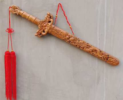 在传统观念中,认为桃树是五木之精,所以又被称之为仙木,所以大家认为桃木有着辟邪镇宅的作用,所以桃木剑就因为这个具有了这方面的能力。桃木剑在制作的时候,是选取天然的桃木,桃树树龄越久效果就越好,经过纯手工的雕刻制成,但是现今为了节约成本,很多都是采用机器雕刻的。